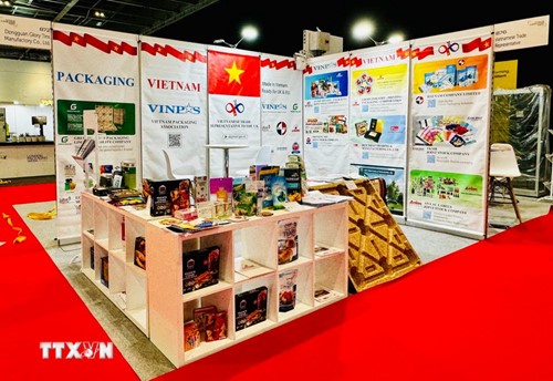 Gian hàng Việt Nam trưng bày các sản phẩm bao bì phong phú, từ vật tư phụ kiện đóng gói như pallet gỗ ép, nhãn hàng tự dính, nhãn cuộn và màng co, tới các loại bao bì chất liệu đa dạng như bao bì màng, bao bì carton gấp sóng, bao PP dệt, bao ximăng…