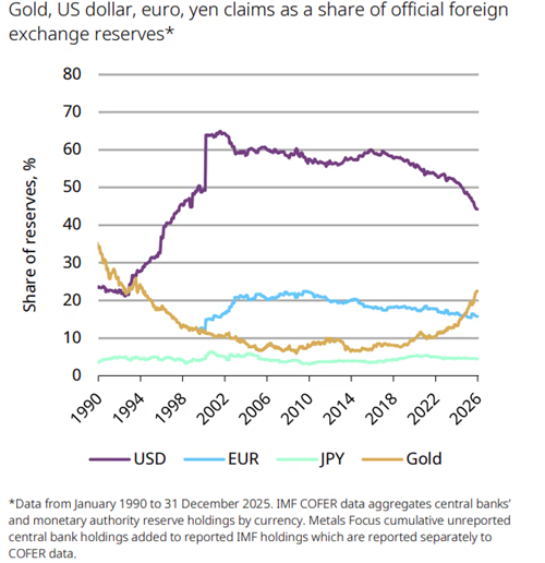 Theo WGC, sau giai đoạn giá vàng tăng mạnh và các ngân hàng trung ương đẩy mạnh tích lũy vàng trong các năm 2022–2025, tỷ trọng vàng trong dự trữ ngoại hối toàn cầu hiện đang tiến gần mức của đầu thập niên 1990. Tuy nhiên, bối cảnh hiện nay cho thấy vai trò của vàng vẫn được củng cố, khi nhiều ngân hàng trung ương tiếp tục quản lý vàng ngoài khuôn khổ dự trữ chính thức và ưu tiên nắm giữ dài hạn.