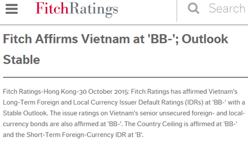 Trong thông báo ra ngày 30/10, Fitch cho biết lý do tổ chức này giữ nguyên xếp hạng và triển vọng tín nhiệm của Việt Nam là nhờ sự ổn định của nền kinh tế vĩ mô cũng như triển vọng vĩ mô khả quan gần đây trong bối cảnh nợ công và thâm hụt ngân sách vẫn còn cao.
