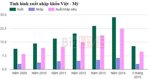 Về phía Việt Nam, số liệu của Tổng cục Hải quan cũng phản ánh Mỹ đang là đối tác xuất khẩu lớn nhất với 28,7 tỷ USD năm 2014, gần gấp đôi nước hai nước đứng sau là Trung Quốc và Nhật Bản.