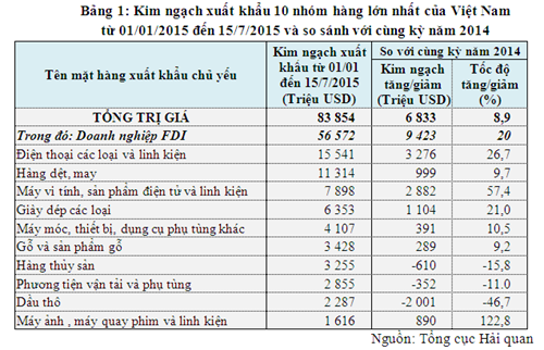 So với nửa cuối tháng 6/2015, kim ngạch xuất khẩu trong kỳ 1 tháng 7/2015 giảm chủ yếu do giảm một số mặt hàng sau: Điện thoại các loại và linh kiện (giảm 400 triệu USD); máy vi tính sản phẩm điện tử và linh kiện(giảm 149 triệu USD); hàng rau quả (giảm 93 triệu USD); giày dép các loại (giảm 73 triệu USD); sắt thép các loại (giảm hơn 59 triệu USD)…