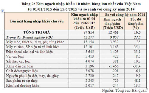 Về nhập khẩu, trị giá hàng hoá nhập khẩu của Việt Nam trong kỳ 1 tháng 6/2015 đạt 7,16 tỷ USD, tăng 2,3% so với nửa cuối tháng 6/2015. Tính đến hết ngày 15/6/2015 kim ngạch nhập khẩu hàng hóa đạt 87,81 tỷ USD, tăng 16,5% so với cùng kỳ năm 2014.