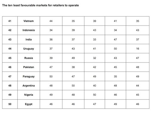 Bảng xếp hạng top 10 thị trướng bán lẻ kém hấp dẫn nhà đầu tư nhất.