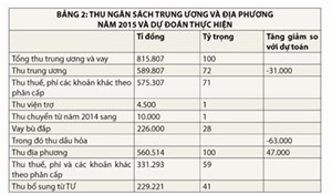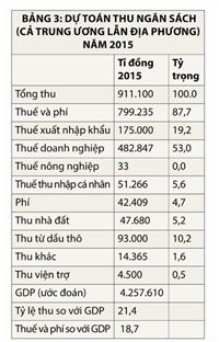Về thu ngân sách năm 2015 và những năm tới, Việt Nam sẽ phải đối phó với hai vấn đề lớn. Thứ nhất, nguồn thu từ dầu thô sẽ giảm và tiếp tục thấp. Thứ hai, nguồn thu thuế xuất nhập khẩu cũng sẽ giảm nếu TPP thành hình. Việt Nam dựa chủ yếu vào hai nguồn thu chính là thuế doanh nghiệp và thuế xuất nhập khẩu (chiếm 72% số thu thuế và phí), trong khi các loại thuế khác có tỷ trọng thấp hơn nhiều. Điều này ngược lại với các nước phát triển, dựa chính vào thuế thu nhập cá nhân và đóng góp bảo hiểm xã hội.