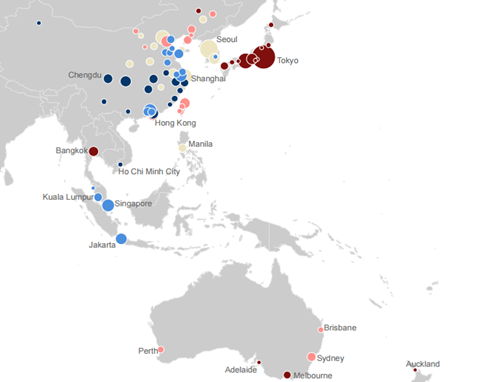 Trong số này có 49 thành phố của Trung Quốc, 19 thành phố Nhật Bản, Hàn Quốc và Đài Loan, 12 thành phố ở Bắc Mỹ, 7 thành phố Đông Nam Á (trong đó có TPHCM) và Mỹ Latinh, 6 thành phố của Úc và New Zealand. Một số thành phố trong nhóm này có nền kinh tế tăng trưởng nhanh nhất thế giới.