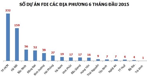 Dưới đây là bảng xếp hạng thu hút FDI các địa phương trong 6 tháng đầu năm 2015: