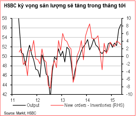 HSBC tin rằng sản lượng sẽ tiếp tục tăng trong những tháng tới dù mức tăng khá nhẹ. Chỉ số hàng đầu là đơn hàng mới trừ đi hàng tồn kho đã giảm nhẹ từ mức 3,7 còn 3,1 điểm. Hàng tồn kho đang tăng lên phản ánh niềm tin của các nhà sản xuất về nhu cầu trong thời gian sắp tới. Vì đơn hàng mới đang tăng mạnh, báo cáo phân tích sẽ có nhiều cơ hội cho lĩnh vực sản xuất tăng trưởng trong tương lai.