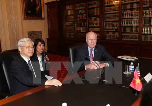 Thay mặt các nghị sĩ hai Viện, ông Patrick Leahy hoan nghênh Tổng Bí thư Nguyễn Phú Trọng và Đoàn đại biểu cấp cao Việt Nam thăm chính thức Hoa Kỳ. Chuyến thăm lần này diễn ra vào thời điểm kỷ niệm 20 năm quan hệ ngoại giao Việt Nam-Hoa Kỳ, đánh dấu thời kỳ phát triển mới trong quan hệ song phương.