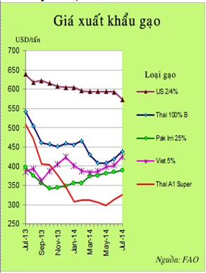 7 tháng đầu năm 2014, Chỉ số giá gạo của FAO trung bình đạt 237 điểm, tăng 2 điểm so với 235 điểm cùng kỳ năm 2013. Chỉ số giá gạo Indica chất lượng cao giảm 7% so với cùng kỳ năm ngoái, chỉ số giá gạo Indica chất lượng thấp giảm 16%, gạo Thơm giảm 2%, trong khi gạo Japonica tăng 14%.