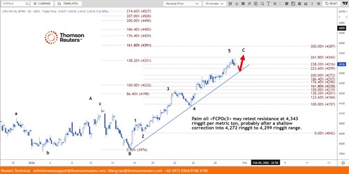 Giá dầu cọ chịu ảnh hưởng bởi giá dầu có liên quan khi cạnh tranh thị phần trên thị trường dầu thực vật toàn cầu. Nhận định của nhà phân tích kỹ thuật Wang Tao của Reuters, giá dầu cọ có thể kiểm tra lại ngưỡng kháng cự 4.343 ringgit/tấn, sau khi điều chỉnh nhẹ quanh vùng 4.272 – 4.299 ringgit/tấn.