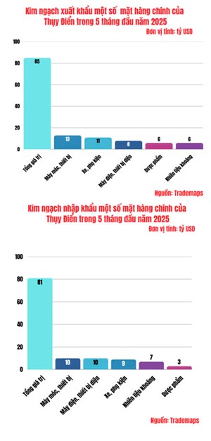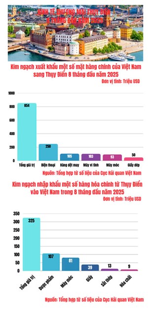 Theo số liệu của Cục Hải quan Việt Nam, trong 8 tháng đầu năm 2025, kim ngạch xuất khẩu hàng hóa của Việt Nam sang Thụy Điển đạt hơn 854,41 triệu USD, tăng mạnh 24,65% so với 8 tháng đầu năm 2024. Trong đó, điện thoại các loại và linh kiện là mặt hàng xuất khẩu lớn nhất với kim ngạch hơn 250,164 triệu USD, tăng 5,08% so với cùng kỳ năm 2024, tiếp theo là hàng dệt may đạt 105,195 triệu USD, tăng 59,88%; máy vi tính, sản phẩm điện tử và linh kiện hơn 103,809 triệu USD, tăng 61,29%.