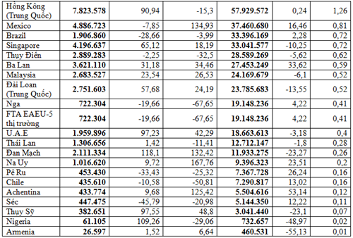Xét về mức tăng trưởng xuất khẩu nhóm hàng này trong năm 2025 so với năm 2024 thì thấy phần lớn các thị trường tăng kim ngạch.