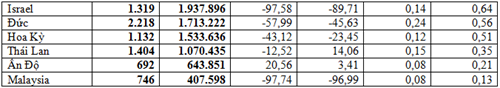 Tiếp đến thị trường Lào chiếm 8,34% về lượng và chiếm 8,69% về kim ngạch, đạt 76.227 tấn, trị giá 26,34 triệu USD, giá trung bình 345,53 USD/tấn; giảm 24,82% về lượng, giảm 0,42% về kim ngạch nhưng tăng 32,45% về giá.