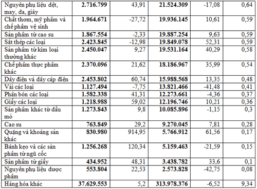 Nhóm hàng Dược phẩm nhập khẩu từ Đức đứng thứ 2 về kim ngạch đạt 343,75 triệu USD, chiếm 10,2% trong tổng kim ngạch, tăng 3,8%. Tiếp đến nhóm hàng Hóa chất đạt trên 227,79 triệu USD, chiếm 6,8%, giảm 32,3%; Sản phẩm hóa chất đạt 225,09 triệu USD, chiếm 6,7% trong tổng kim ngạch, giảm 5,5%.