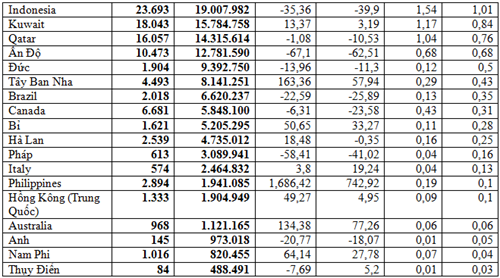 Tiếp sau đó là thị trường Hoa Kỳ với 203.106 tấn, trị giá 197,8 triệu USD, giá trung bình 973,9 USD/tấn, chiếm 13,16% trong tổng lượng và chiếm 10,55% trong tổng kim ngạch, so với 2 tháng đầu năm 2025, tăng 39,53% về lượng, tăng 21,8% về kim ngạch nhưng giảm 12,7% về giá.