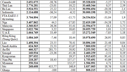 Tiếp đến thị trường Campuchia đạt 96,36 triệu USD, chiếm 7,5%, giảm 29,7% so với năm 2024.
