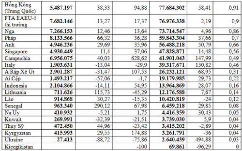 Đứng sau thị trường chủ đạo Trung Quốc là thị trường Hoa Kỳ đạt gần 547,1 triệu USD, tăng mạnh 51,8% so với năm 2024, chiếm 6,4%; Hàn Quốc đạt 307,7 triệu USD, giảm nhẹ 2,3%, chiếm %; Nhật Bản đạt 238,03 triệu USD, tăng 17,1%, chiếm 2,8%; Đài Loan đạt 172,29 triệu USD, tăng 9,7%, chiếm 2%...